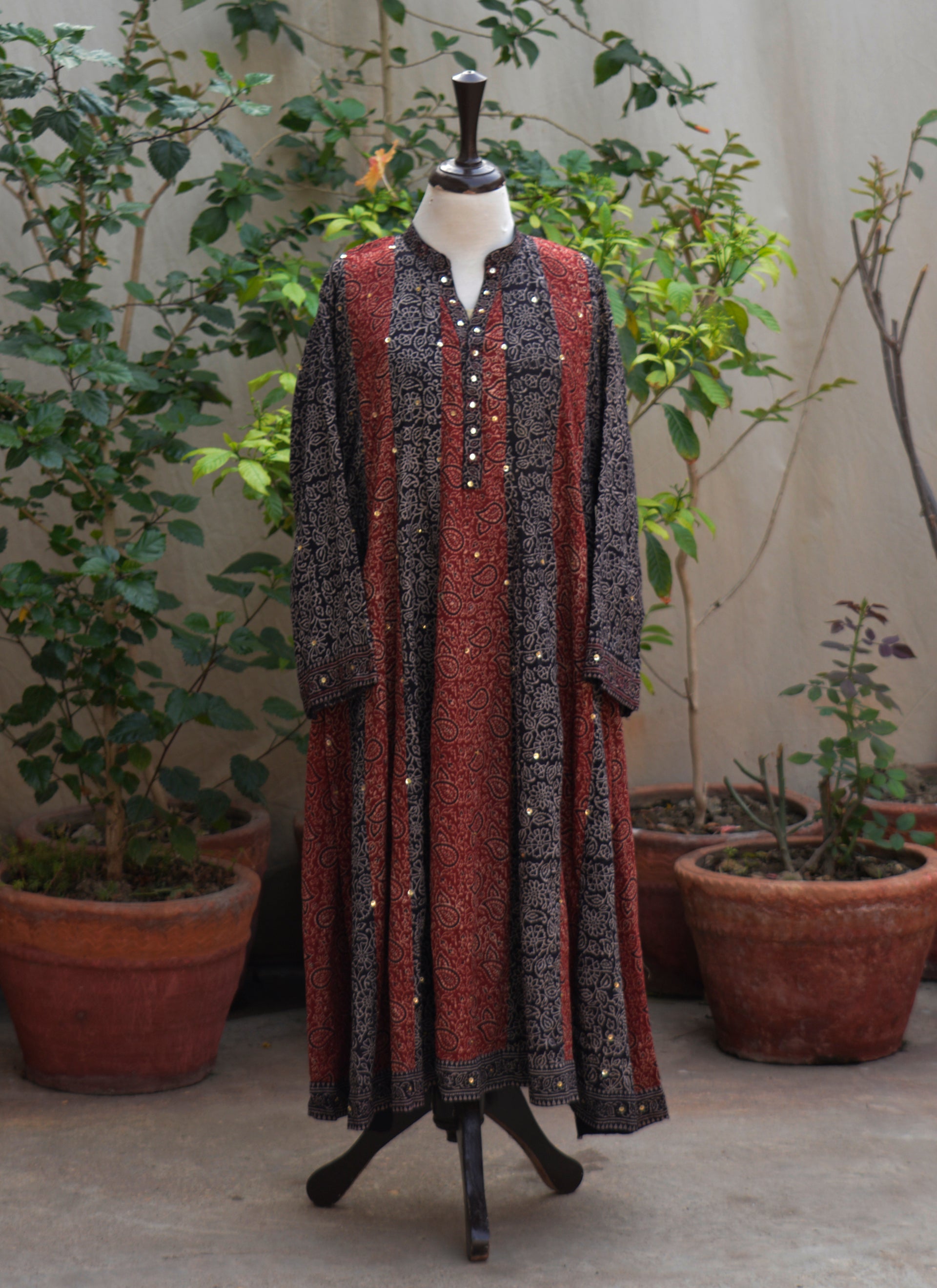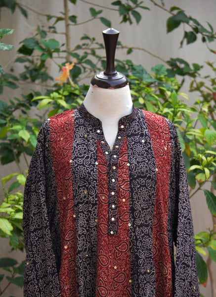 - This garment features traditional Ajrak hand block printing and handcrafted patchwork; slight variations in pattern and color are natural characteristics of handmade textiles.