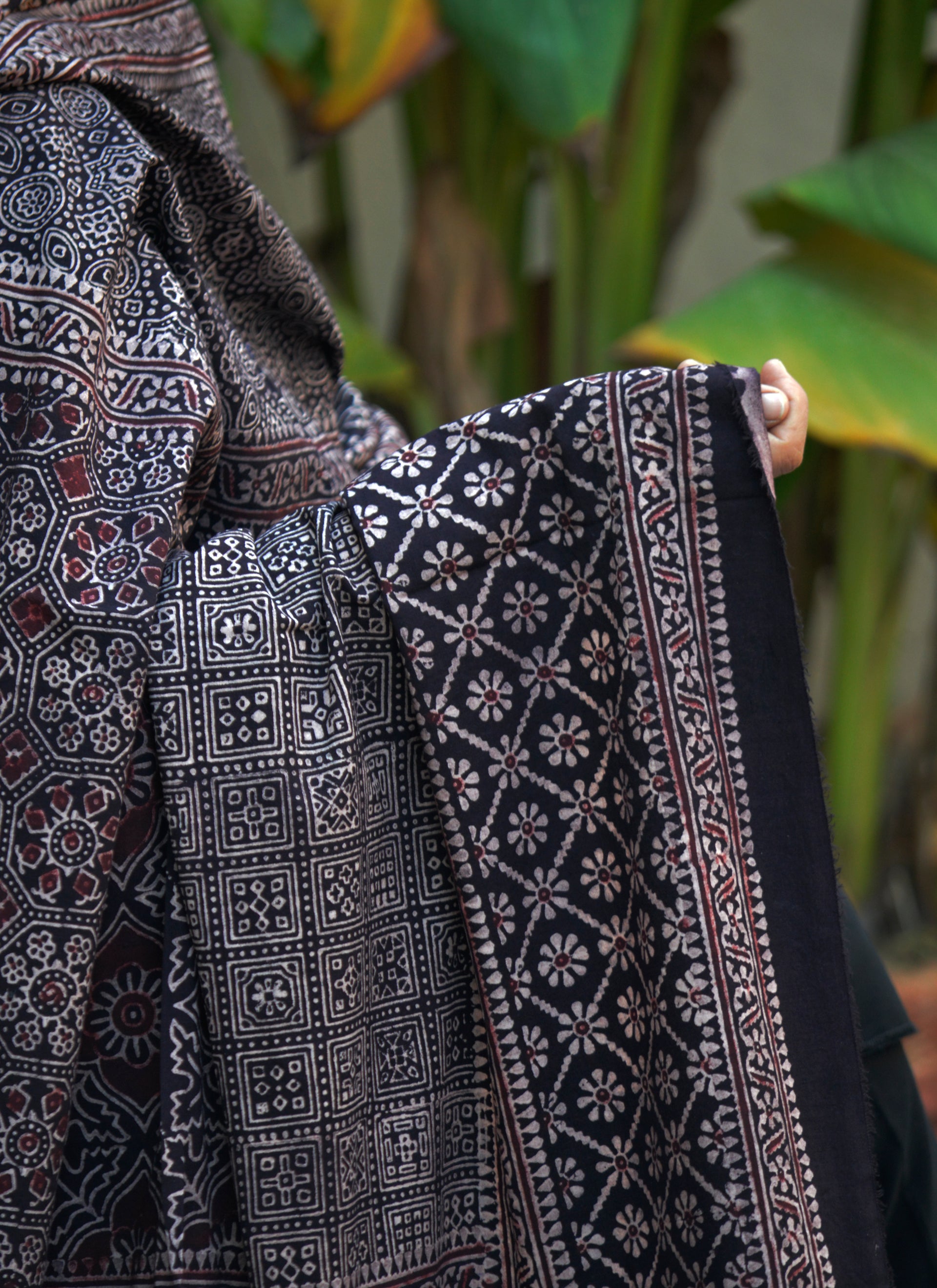 First and foremost, our Ajrak chaadar showcases authentic craftsmanship through traditional hand block printing techniques passed down through generations. Each piece reflects the dedication and skill of the artisans, resulting in intricate patterns and textures that highlight the beauty of traditional Ajrak artistry.