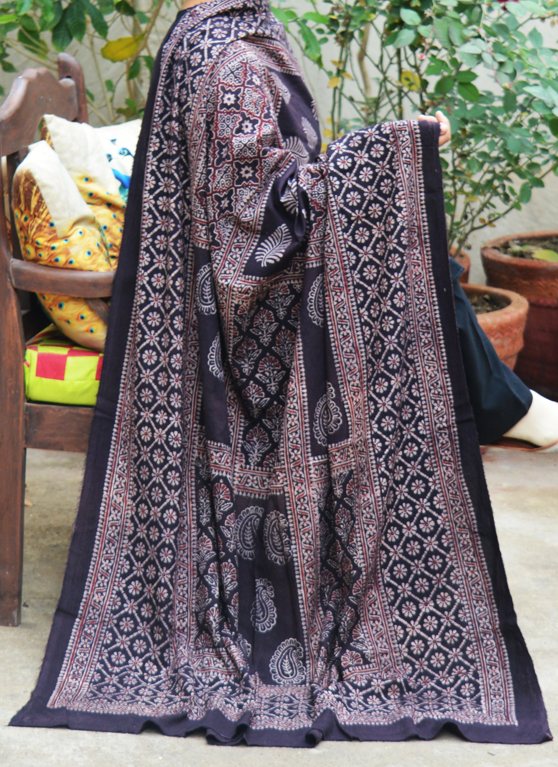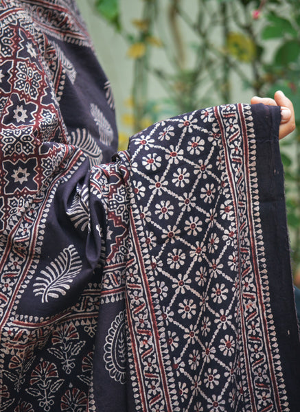 Refined, bold, and timeless, the Organic Dye Hand Block Printed Ajrak Chadar Multi Blocks Black with Maroon Filling is a statement piece crafted for those who value authentic artistry and conscious fashion. This chadar features a striking multi-block Ajrak pattern, where deep black tones are beautifully contrasted with rich maroon filling, creating depth, elegance, and visual balance.