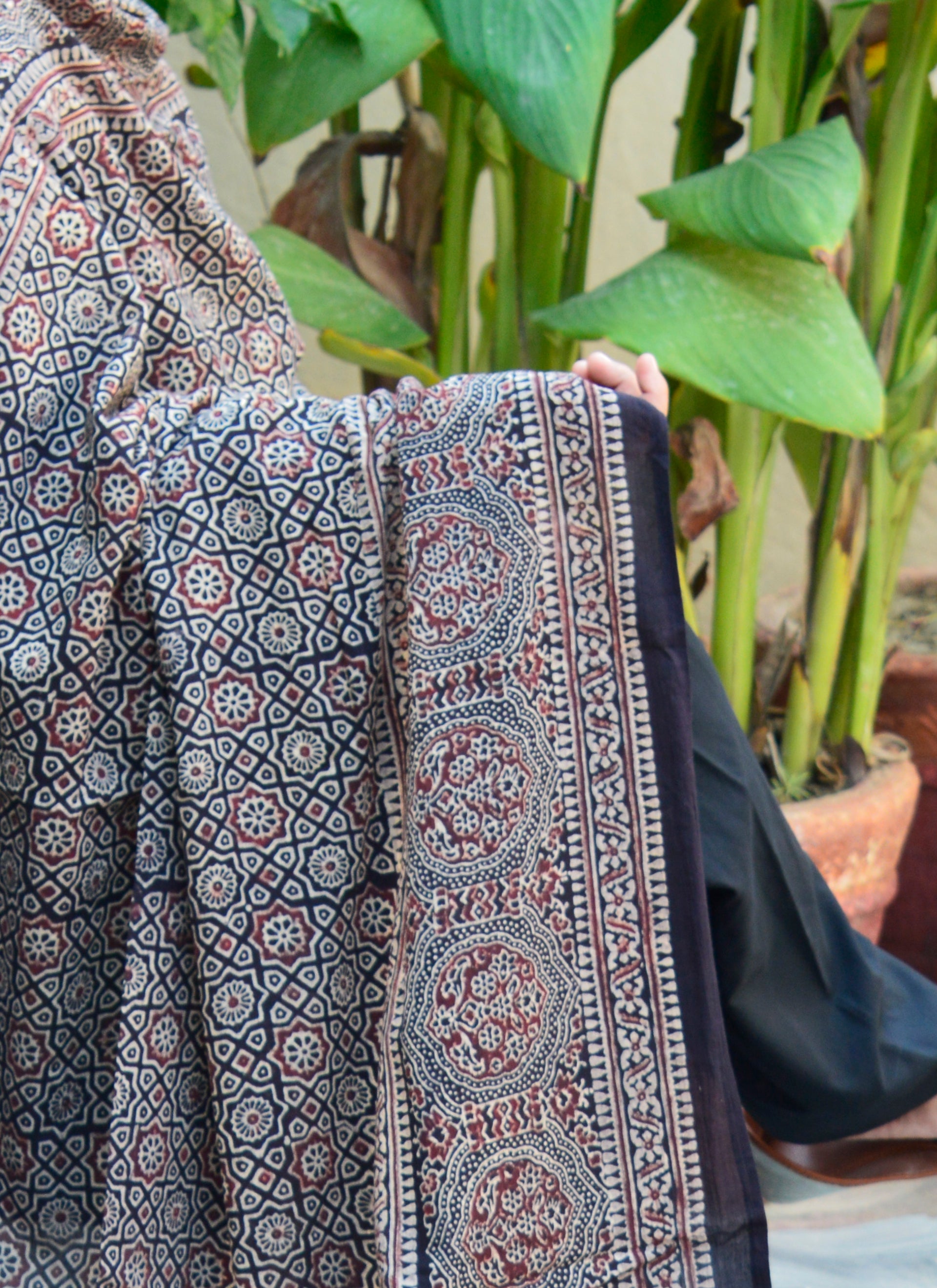 Wrap yourself in the timeless beauty of Sindhi craftsmanship with our Ajrak Chadar Moroccan Design, a luxurious cotton shawl created using the centuries-old hand block printing tradition. Crafted with organic plant-based dyes, this chadar embodies sustainable fashion and cultural heritage.