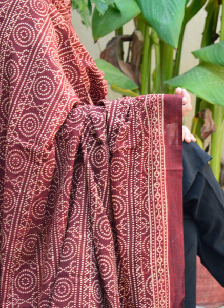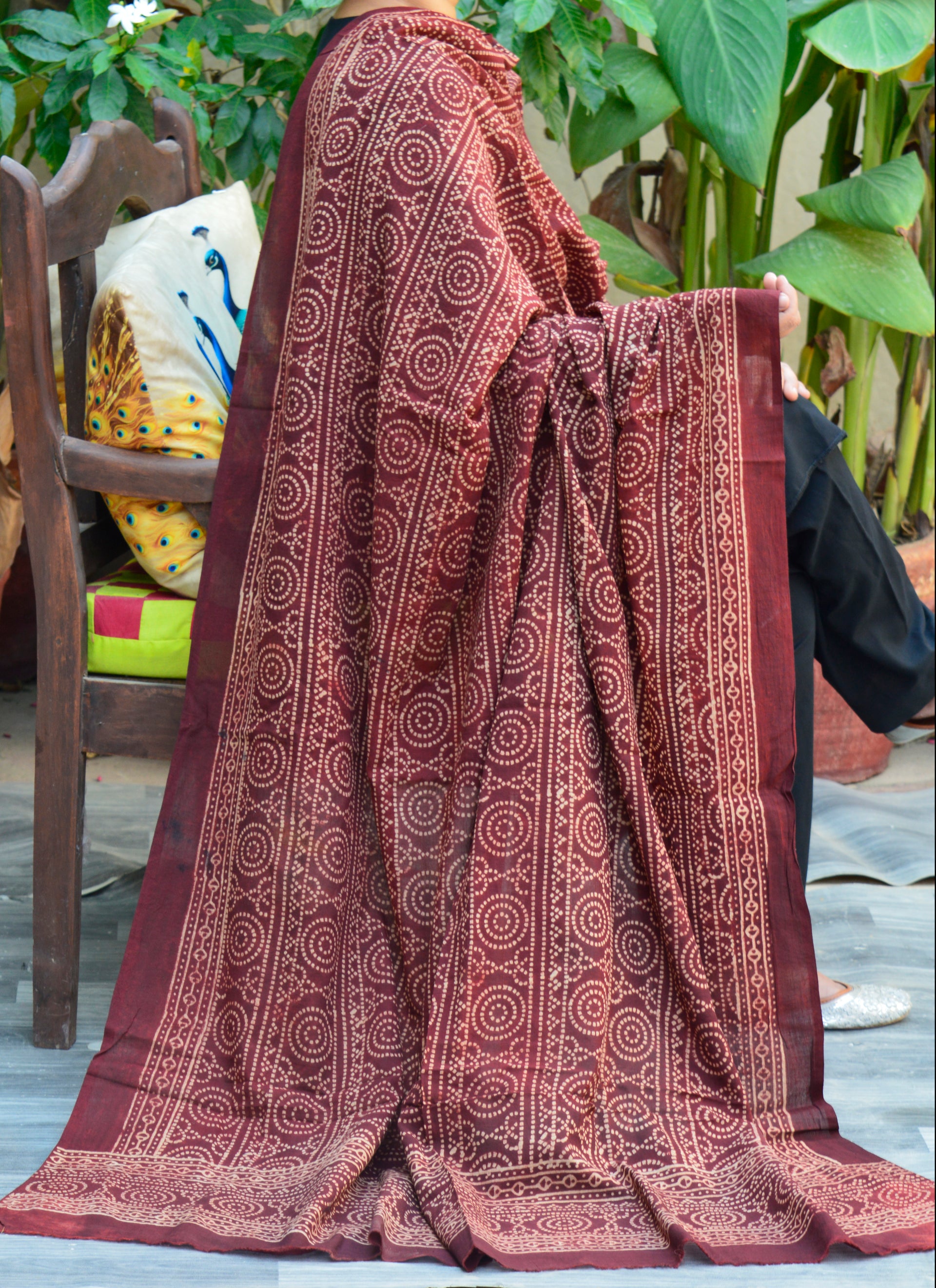 Experience timeless Sindhi craftsmanship with the Ajrak Chadar Royal Maroon, a hand block printed Chunri masterpiece dyed using organic, plant-based colors. Crafted from premium Lawn cotton, this chadar embodies the essence of heritage and elegance, showcasing intricate Ajrak motifs in royal maroon hues.