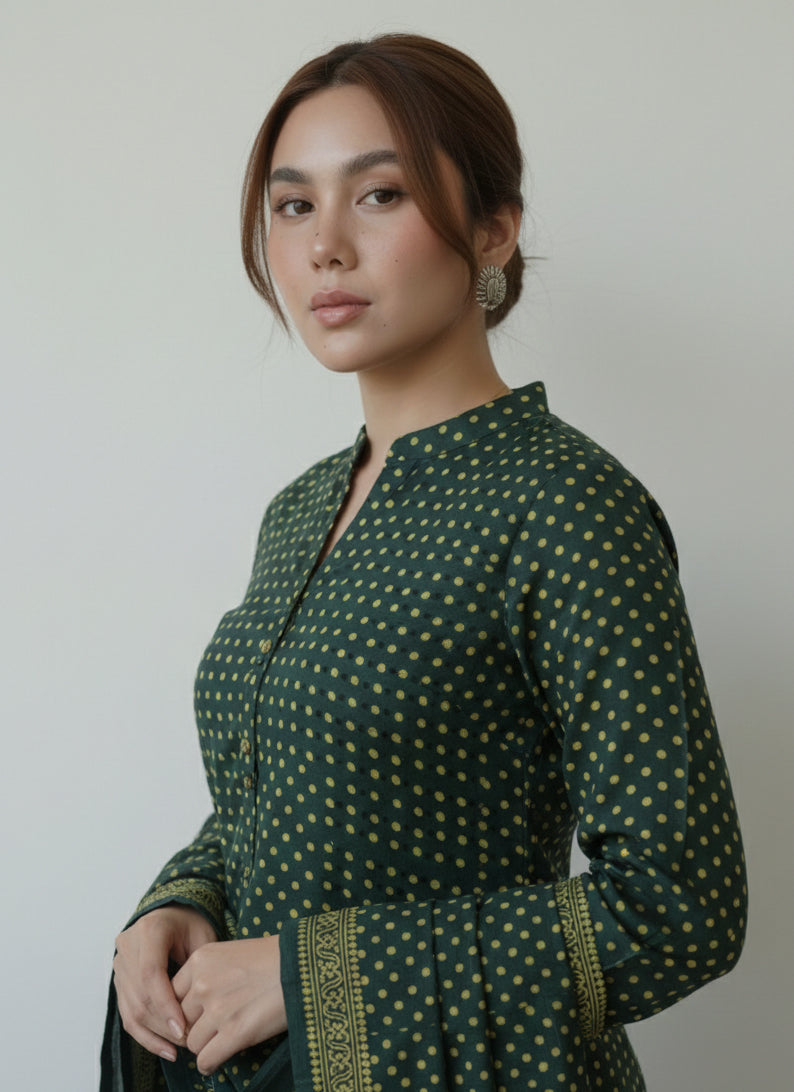 Step into timeless style with our Natural Dye Hand Block Printed Ajrak Green Polka Dot Dress, a perfect blend of tradition, sustainability, and everyday elegance. This stunning dress is crafted using eco-friendly natural dyes and features hand block printed Ajrak polka dot motifs in vibrant green, a true nod to centuries-old Sindhi craftsmanship.
