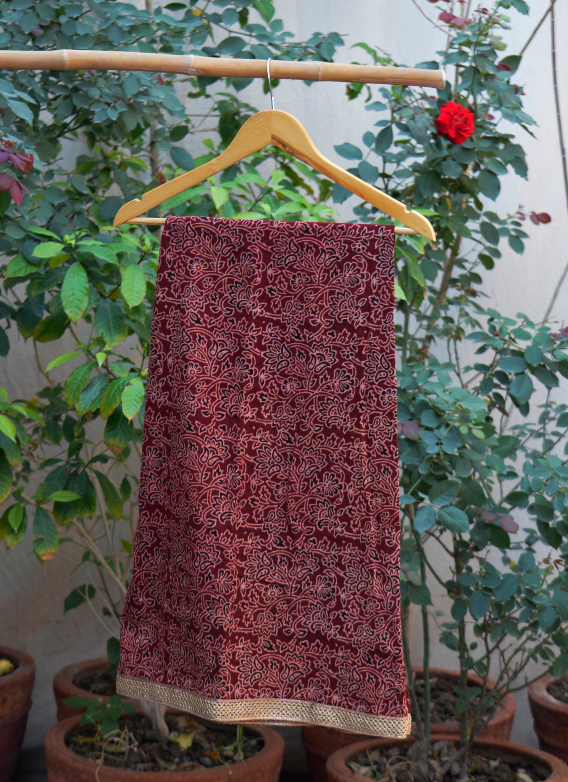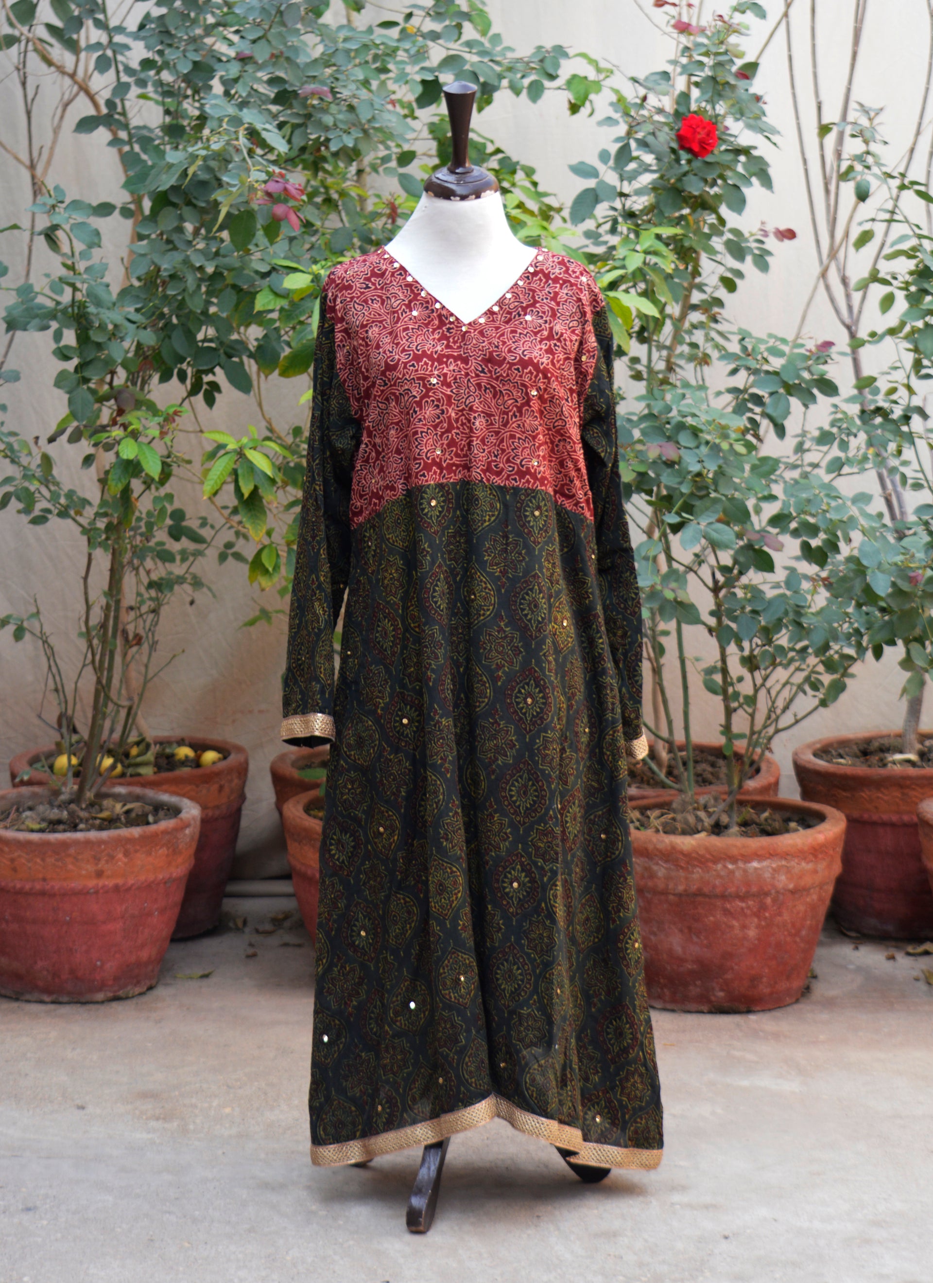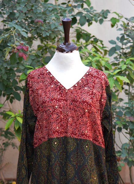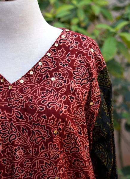 This two-piece stitched outfit blends traditional Ajrak artistry with celebratory embellishment — ideal for festive gatherings, cultural occasions, and evening wear.