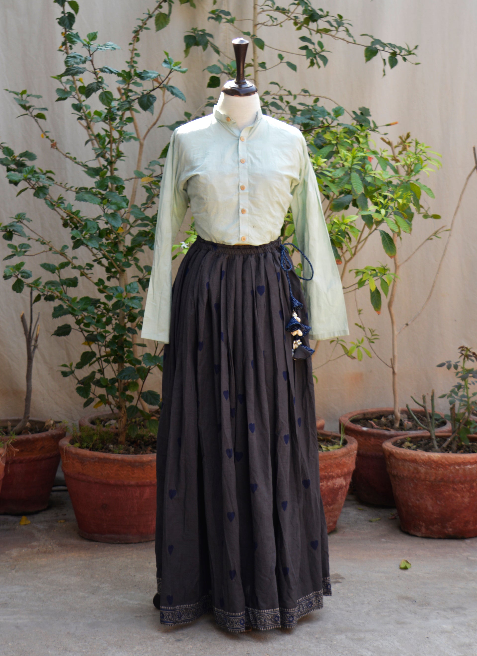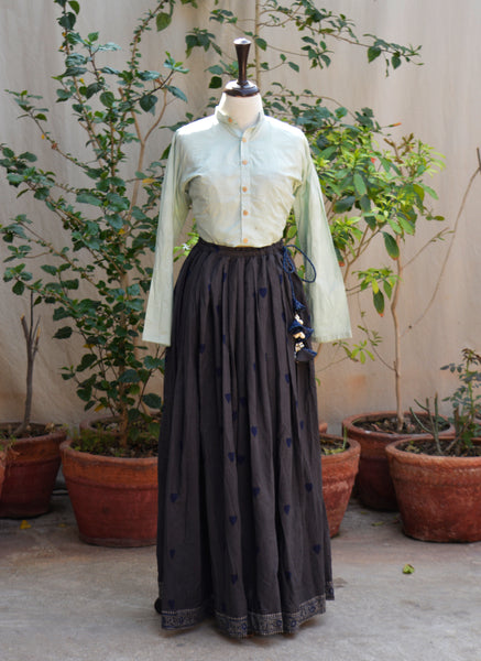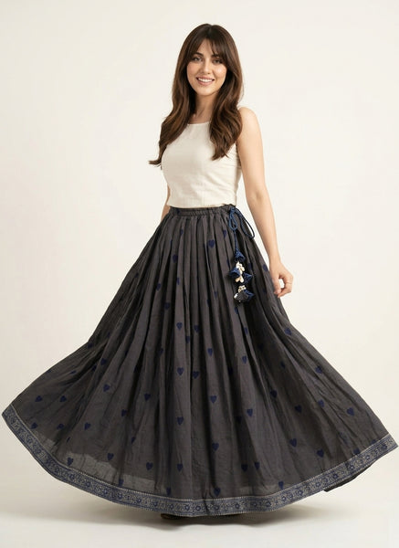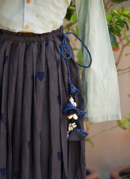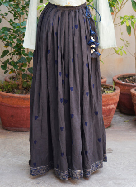 A graceful grey Ajrak skirt in premium lawn featuring blue heart motifs, a flowing 5-meter flare, and an adjustable waist dori adorned with sea shell tassels and blue floral Ajrak cord for distinctive bohemian elegance.